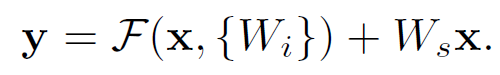 위 식은 동일하게 building block을 정의하는 식인데 단지 x와 F의 차원을 맞춰주기 위한 항이 추가되었다고 보면 된다. 만약 입력과 출력의 차원이 다르다면 linear projection W_s를 이용해서 차원을 맞춰줄 수 있다.
